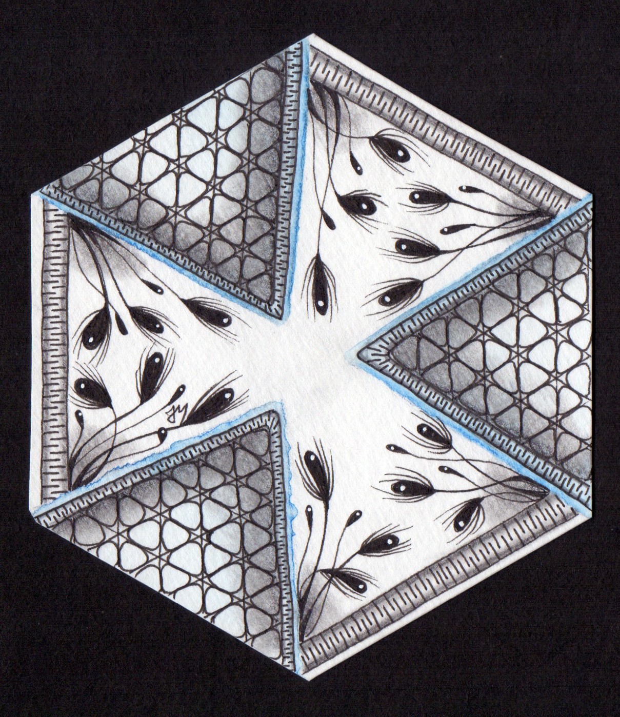 | My third Relaxagon - I laid a light colour wash of 3 blue triangles before I tangled - but the colour mostly disappear when I shaded, leaving only a hint of blue. N'Zeppel, feathered Fescu and Doodah. |